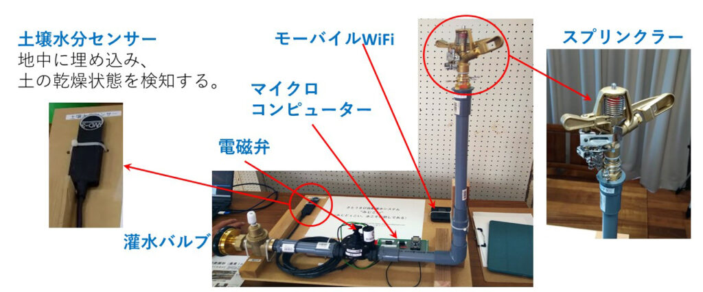 畑の地中20cmに埋め込んだ水分センサーにより、畑の乾燥状態を検知し乾燥しすぎていたら、畑灌バルブに繋がれた電磁弁を開き、スプリンクラーや灌水チューブを通して自動的に灌水(かんすい)します。所定の灌水時間を終えたら、自動的に電磁バルブを閉め灌水を終了します。